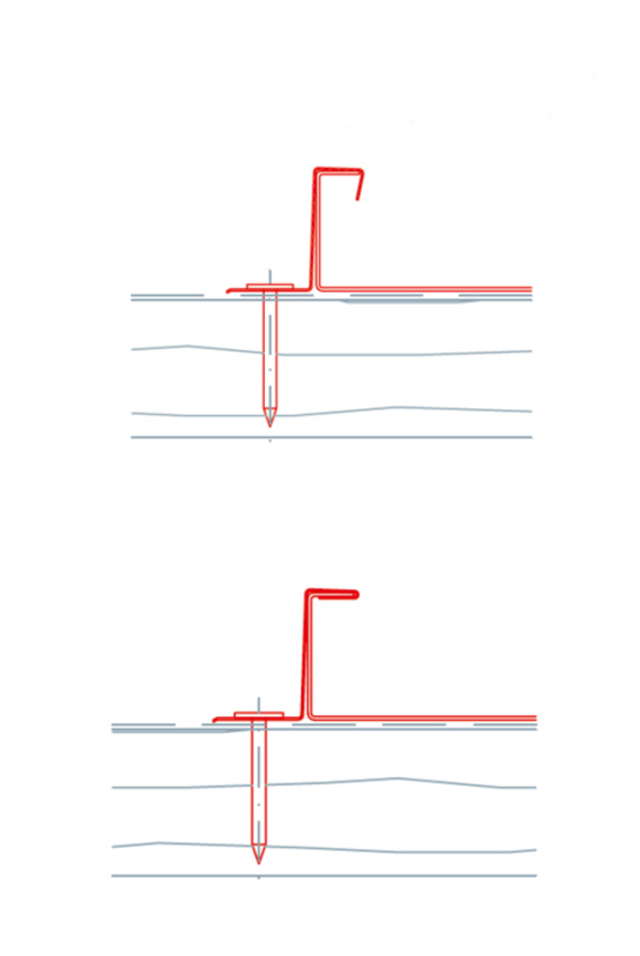 Til festing av stående falstekkinger skal det brukes klips med spiker, skruer eller nagler av rustfritt stål. Av denne grunn tilbyr PREFA rustfrie rillespiker i forskjellige lengder for feste av PREFALZ-tekkinger.