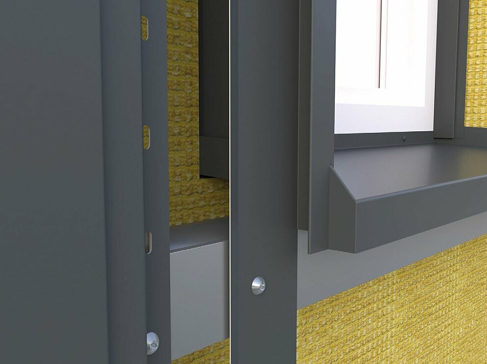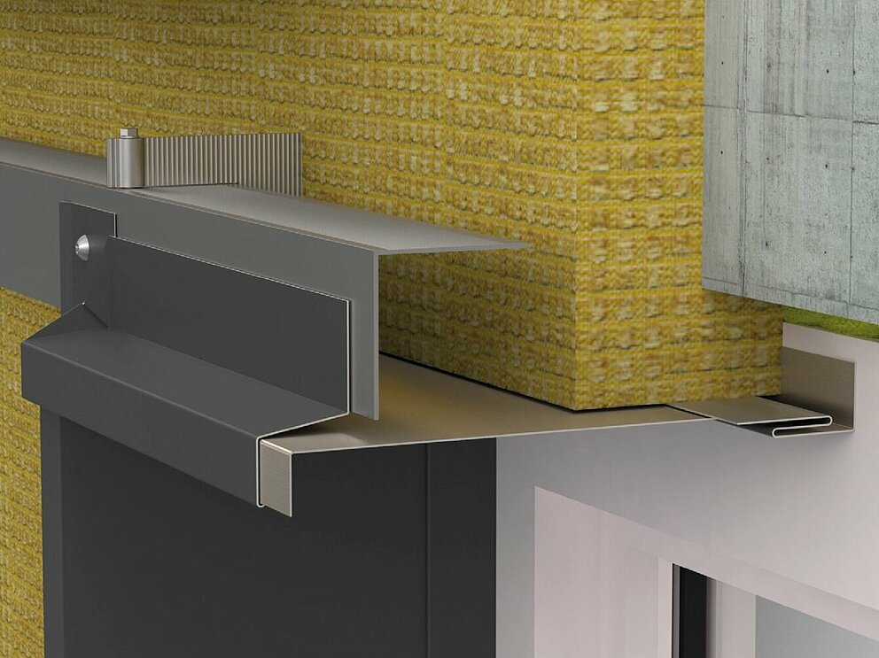 Festebrakettene for soffit-platen skrues deretter på underkonstruksjonen til venstre og høyre for vinduet. Samtidig festes koblingslistene for støpeplaten og koblingsstrimmelen for vindusforlengelsen også til vindusrammen eller murverket.