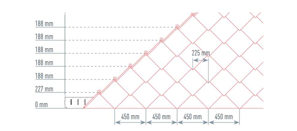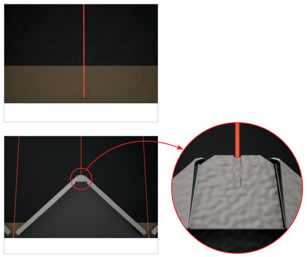 For å hjelpe til med installasjonen av PREFA-veggrombene 29 × 29, anbefales det å lage et rutenett av vertikale snorslag i en avstand med 450 mm mellomrom (markeringene i kantlisten fungerer som hjelpemiddel). For å opprettholde snørelengden nøyaktig i hver rad, kan halve snørelengden også tegnes om nødvendig og kontrolleres med jevne mellomrom. Juster startplatene med hakkene (på øvre kant av startplatene) langs de vertikale snorslagene (se illustrasjonen nedenfor). Sørg for at arealet for sideoppkant (f.eks. sideavslutning eller bygningshjørner) ikke ligger midt i veggrombe 29 × 29 (ta hensyn til symmetrien i fasadeflaten).