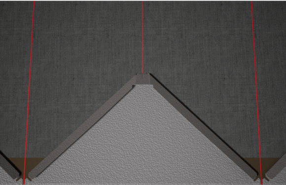 For å hjelpe til med installasjonen av PREFA-veggrombene 44 × 44, er det tilrådelig å produsere et rutenett av vertikale snorslag i en avstand på 675 mm (markeringene i kantlisten fungerer som hjelpemiddel). For å opprettholde snørelengden nøyaktig i hver rad, kan halve snørelengden også tegnes om nødvendig og kontrolleres med jevne mellomrom. Juster startplatene med hakkene (på øvre kant av startplatene) langs de vertikale snorslagene (se illustrasjonen nedenfor). Sørg for at arealet for sideoppkant (f.eks. sideavslutning eller bygningshjørner) ikke ligger midt i veggrombe 44 × 44 (ta hensyn til symmetrien i fasadeflaten).