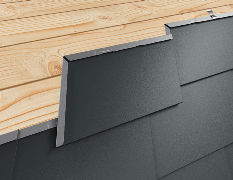 Veggshingel legges fra høyre til venstre og bør legges i rader (i horisontale rader). Forskyvningen fra rad til rad er 1/3 – se "V"-merket på den øvre falsen på shinglene. Festingen av hver shingel utføres med en klips og en medfølgende rillespiker 2,8/25 (= basisfeste). Festingen av hver veggshingel XL utføres med to klips og to rillespiker 2,8/25 I spesielt stormutsatte områder er det nødvendig å beregne vindbelastningen, og festet må tilpasses i henhold til beregningen.