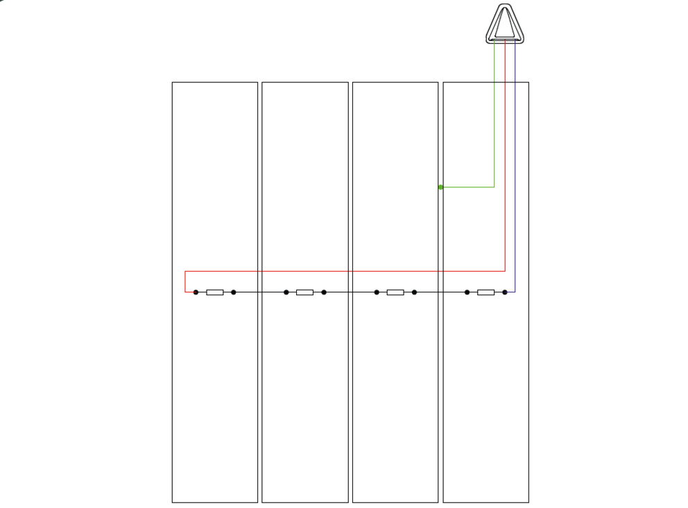 Et anlegg for solcellemodul PREFALZ trenger en tilførsel og en avledning per streng. I den følgende skjematiske tegningen av kablingen er tilførselen vist i blått, avledningen i rødt, potensialutjevningen i grønt, og modulledningene i svart for å gjøre det lettere å forstå.