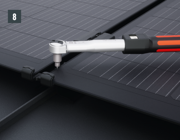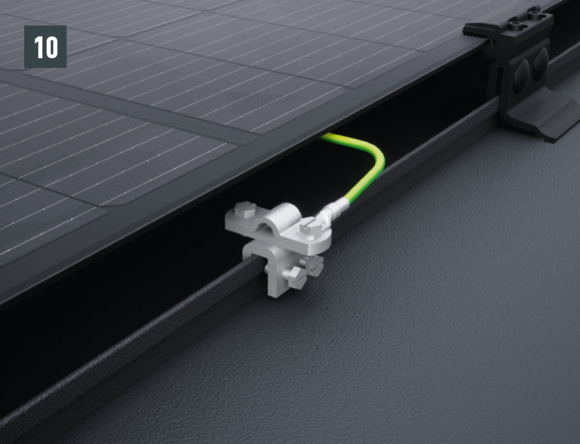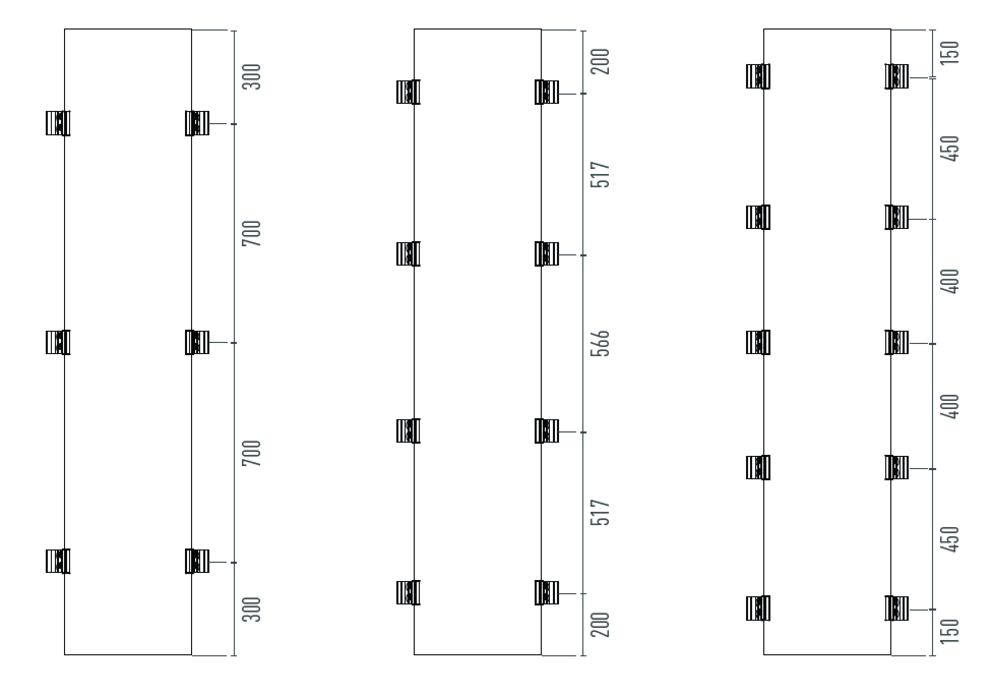 Skissen viser tre ulike varianter for montering av solcellemodul PREFALZ med 6, 8 eller 10 festepunkter. Illustrasjonen viser hvilken avstand festene skal monteres med, avhengig av foretrukket variant.
