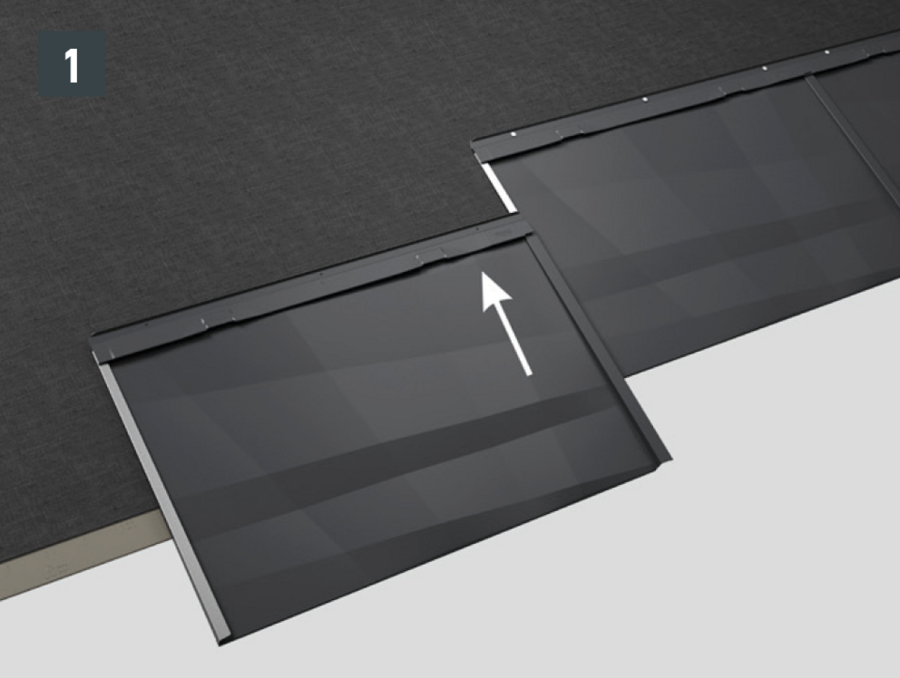 • Juster takpanel FX.12 og skyv den inn i falsene (fig. 1 + 2). Skyv den nedre kanten av panelet litt med hammerhåndtaket.