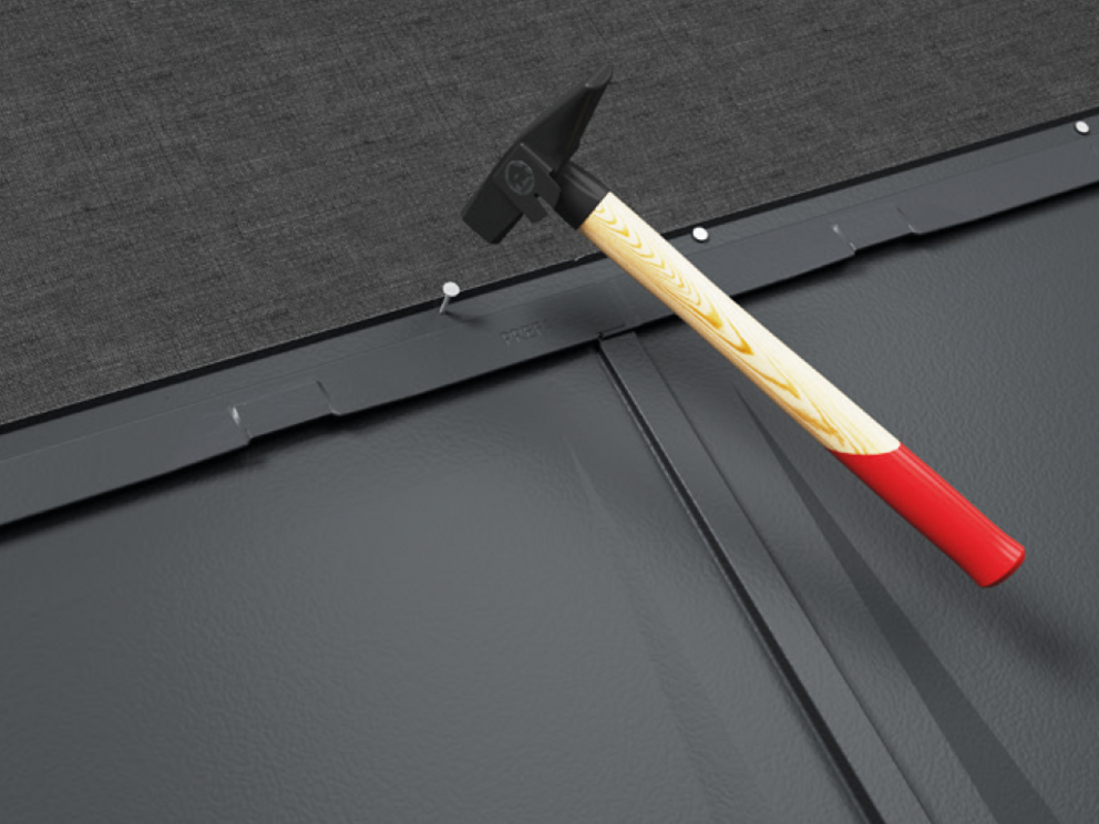 Fest takpanelene R.16 med de medfølgende PREFA-rillespikrene 2,8/25 (basefeste 3 stk. per takpanel R.16). Med PREFA-tekkinger over bitumenlag med flere lag (f.eks bitumenshindler), trenger du lengre rillespiker (f.eks. 2,8/40). Oppgi det separat ved bestilling.