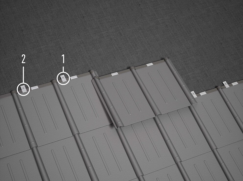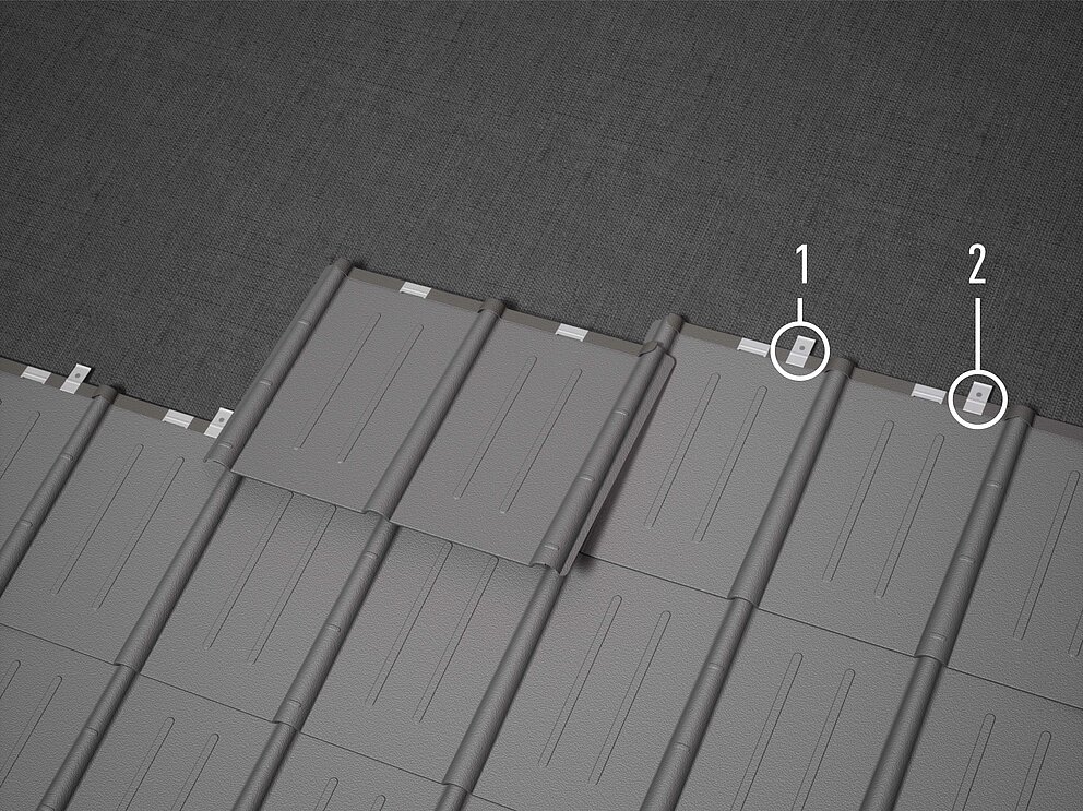Klipsen må plasseres ca. 3 cm inntil platesporet. I spesielt stormutsatte områder er det nødvendig å beregne vindbelastningen, og festet må økes i henhold til beregningen eller man må feste med skruer i stedet for spiker. Er festet med økt vedheft iht. beregning ikke tilstrekkelig, kan et direkte feste monteres på siden av akselutløpet (underliggende aksel) med 2 stk. Halvrundhodeskruer (4 × 25 mm) per plate skal monteres. Klipsplasseringen er avhengig av tekkeretningen. Det patentklipsen for takplater og takshingel er utstyrt med en ekstra kornstørrelse. Denne kornstørrelsen gjør det lettere å spikre gjennom hvis dette ikke er mulig med det forhåndsbestemte hullet (f.eks. på grunn av grenhullet, mellomrommet i forma).