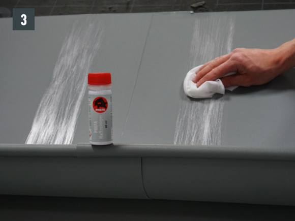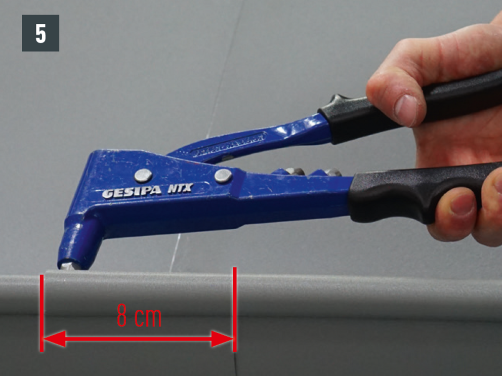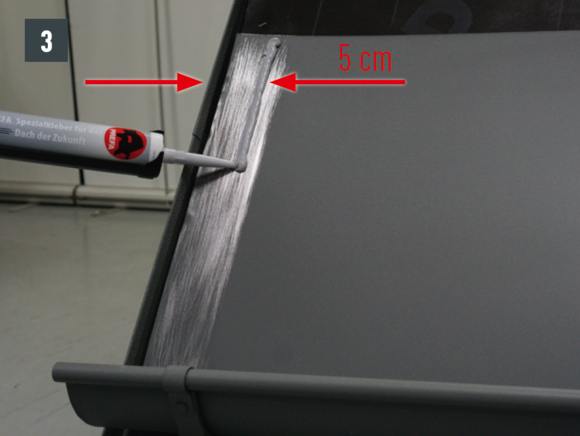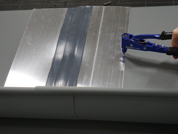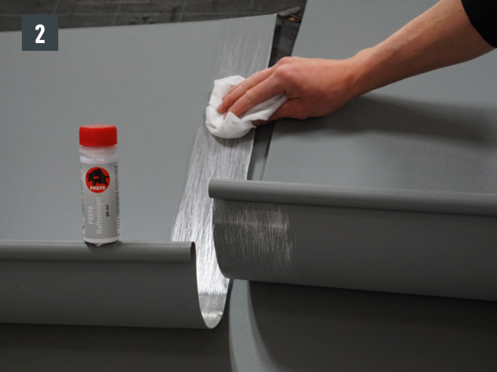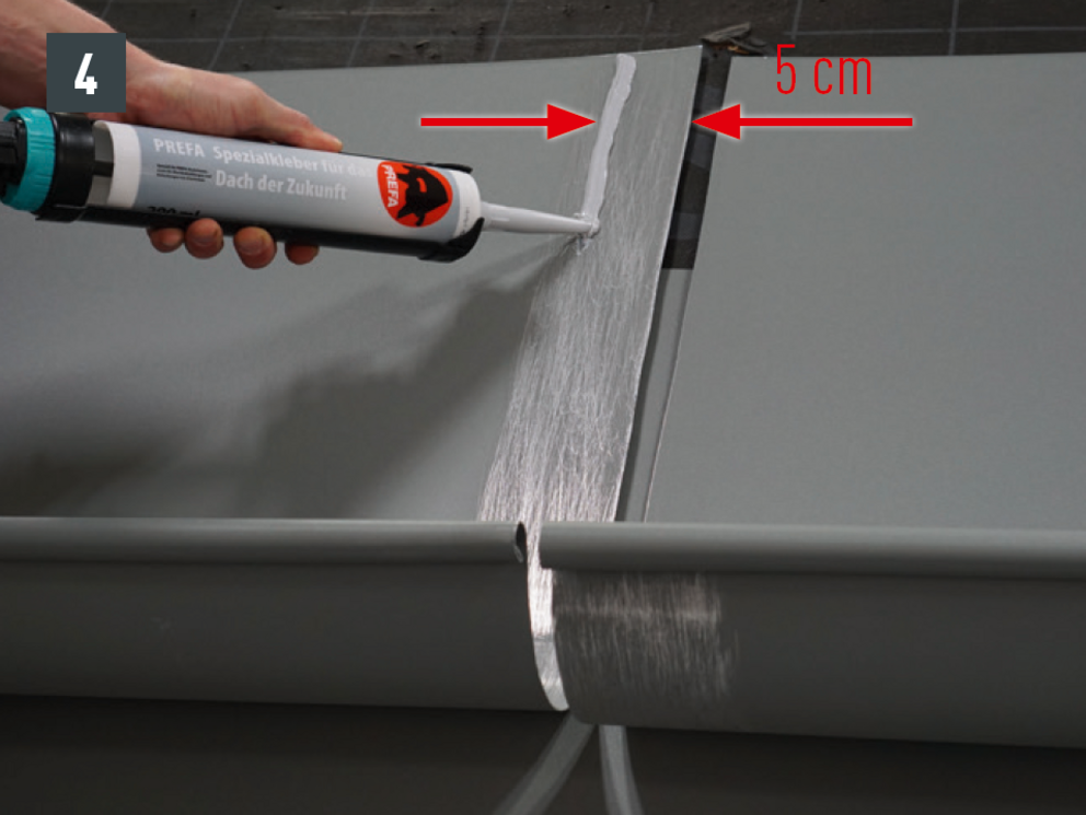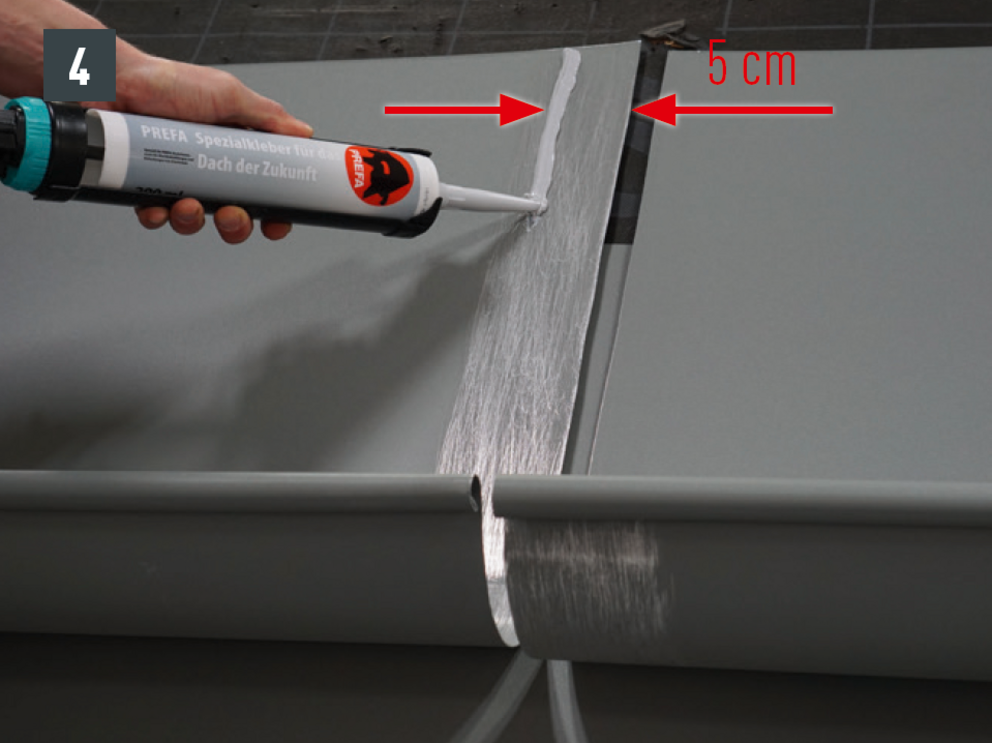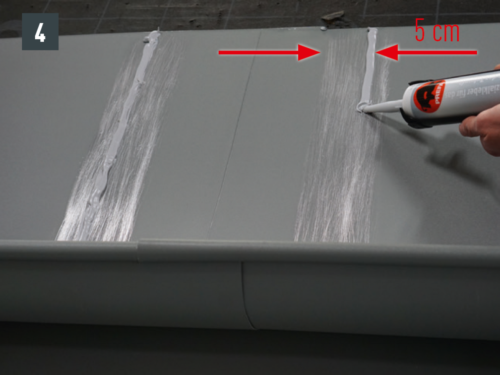 Kantkanalforbindelsen kan også brukes som en naglet forbindelse med 20 stk. PREFA-patentnagler 4 x 9,5 mm kan produseres i korssting og forsegling ved hjelp av PREFA spesialsilikon.