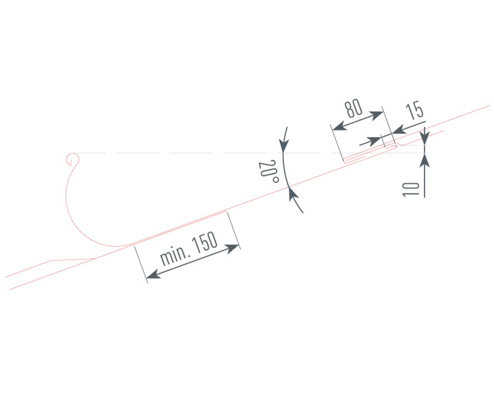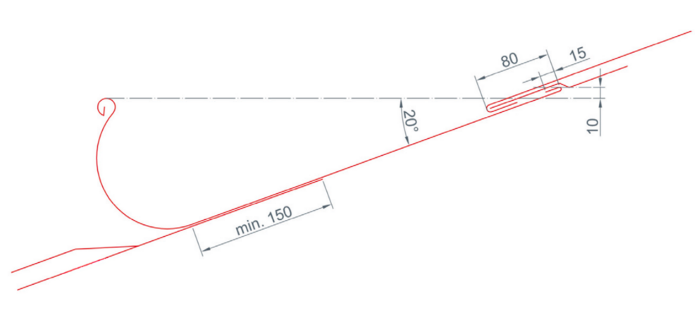 Det må sikres at den bakre kanten på taksiden ligger 10 mm høyere enn forsiden av kantrennen. Dette resulterer i en minste takhelling på 20° for PREFA-kantkanalen (se figuren nedenfor).