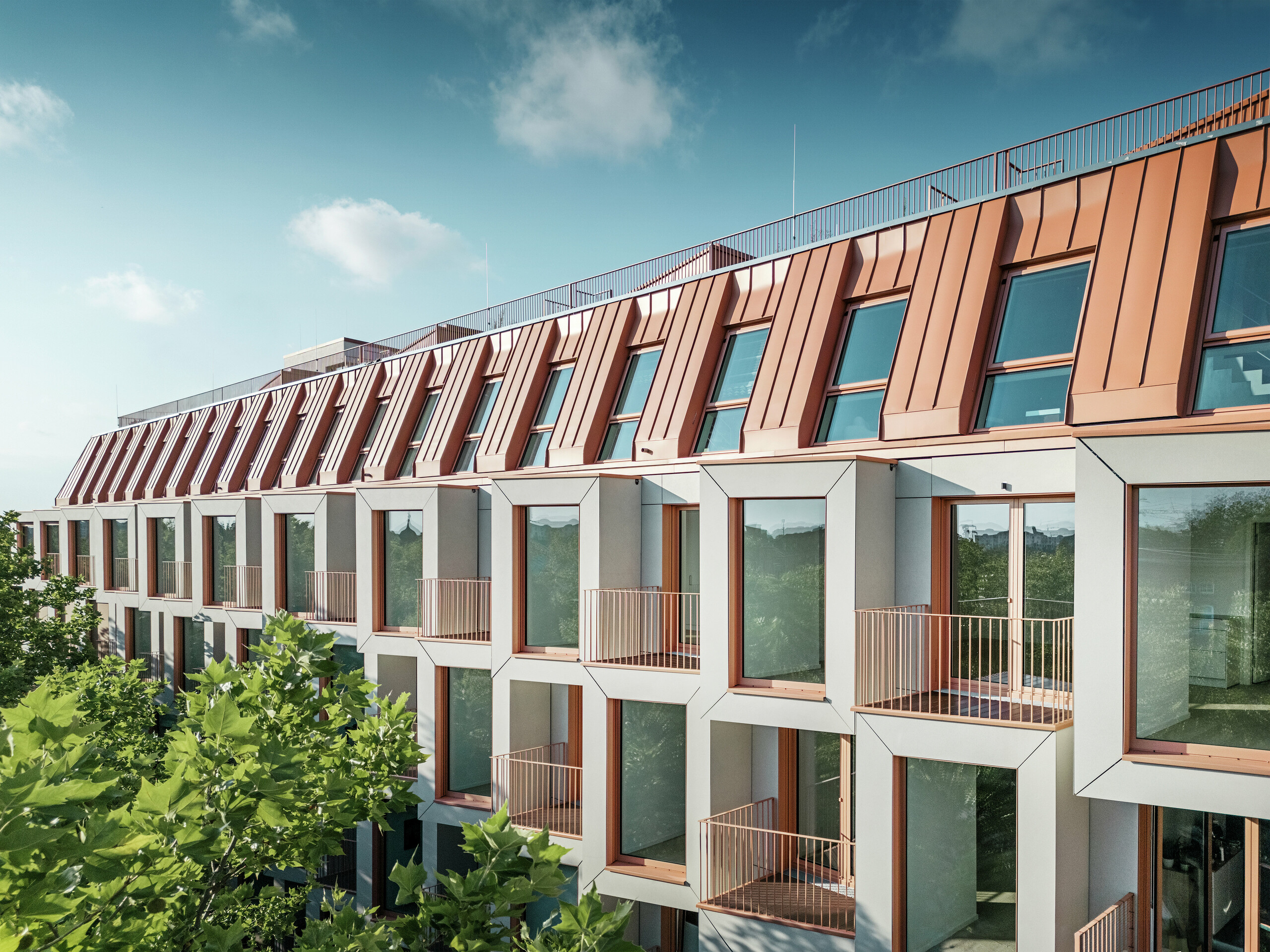 Særlig iøynefallende er fasaden med skråstilte, stablede karnapper. De fremtredende karnappelementene er kledd i luftede glassfiberbetongplater. Fargene er et samspill av kobberoransje, en lett lakserosa og varm betonggrå. Fasaden skal skape en interaktivt nivå, et «se og bli sett», forklarer prosjektleder Sven Disser fra Bauwerk. Effekten er ønsket. Fasaden med de utragende karnappene, de store glassflatene og balkongflatene blir en møteplass for husets beboere og skaper rom for interaksjon langs byggets yttergrense.