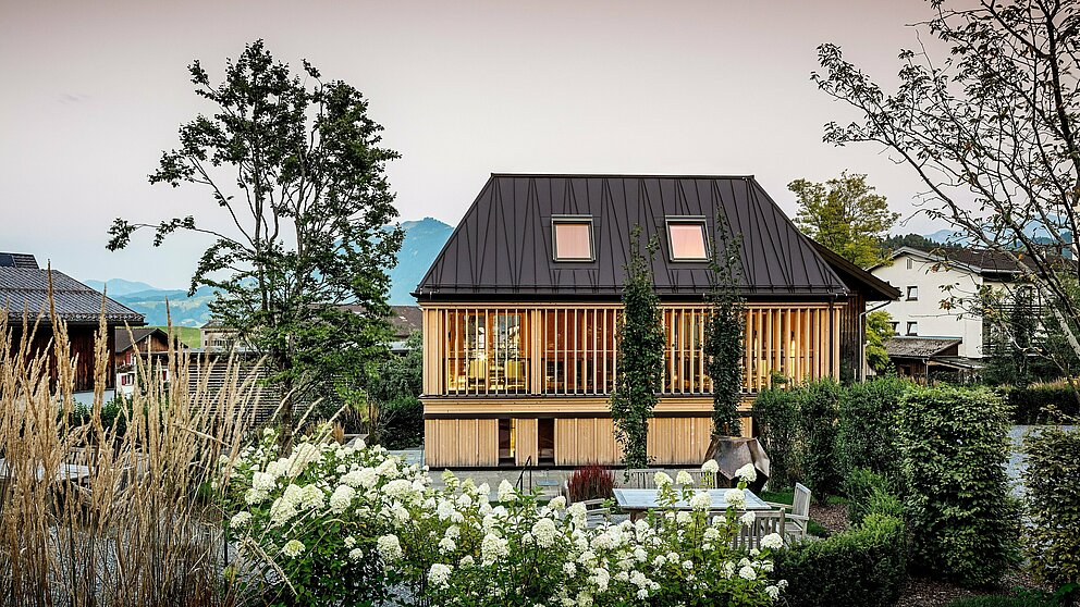Arkitektenes mål var å fullføre hotellets bygningstrilogi på en harmonisk måte. Som bygning nr. 3 i rekken måtte «badehuset» passe til tradisjonen, topografien og arealet, og dessuten tilpasse seg karakteristikkene til tradisjonelle hus i Bregenzerwald. Vel vitende om hvor synlig taket ville bli i det historiske landsbysentrumet, utviklet NONA en egen visjon: «Vi var sikre på at vi ønsket dette taket på bygningen», forteller arkitekt Anja Innauer om konseptet: et 60 graders PREFA tak med atypiske stående falser som løper delvis skrått over takflaten. En vågal idé som først ble møtt med skepsis. Men sammen med prosjektlederne Flatz & Jäger klarte arkitektene å overbevise byggherrene, naboene og håndverkerne i en åpen samtale om denne modige reinterpretasjonen av tradisjonelt formspråk.