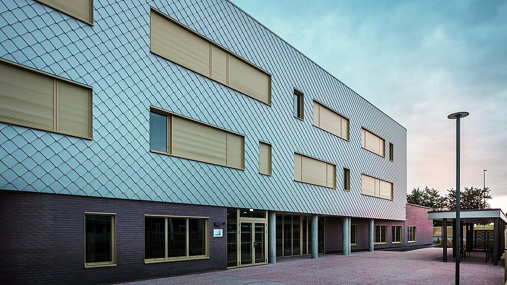 Løsningen var å kombinere to materialer: brunlig teglstein i sokkelområet og en sølvaktig, skimrende aluminiumsfasade i overetasjene. Dette todelingen ser elegant ut, og er dessuten standhaftig og hverdagsfunksjonell. Rundt 15 000 PREFA veggromber 29 x 29 i sølv metallic utgjør det ytre skallet. Det er over 1375 kvadratmeter aluminium som er planlagt, produsert og montert. Det fargevekslende metallet skaper en levende overflate som skimrer i ulike himmelsfarger avhengig av lyset.