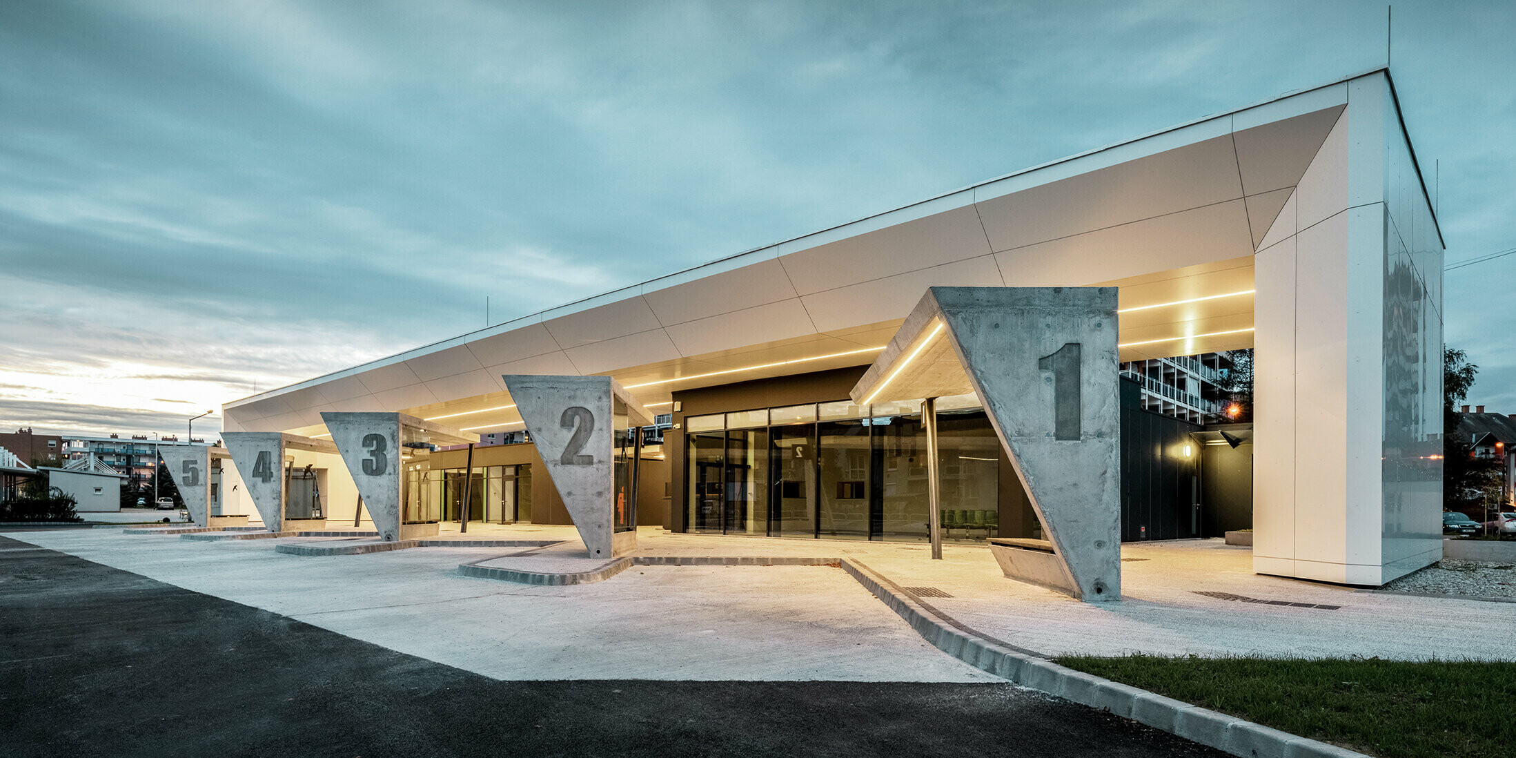 Baldakinen svever bokstavelig talt over stasjonen og muliggjør en beskyttet innstigning på bussen. Arkitekten var på jakt etter noe lett og slitesterkt til tak og fasade for å forsterke denne effekten. Siden han allerede var kjent med PREFABOND aluminiumskomposittpaneler fra tidligere prosjekter, ble bygget så å si planlagt rundt produktet, noe som reduserer avfall. De fire meter lange komposittpanelene smyger seg over det 44 meter lange undertaket og pryder den tunge stålkonstruksjonen med en form for letthet i rent hvitt. Lokalene for venterom etc. ble kledd med PREFABOND i P.10 antrasitt.